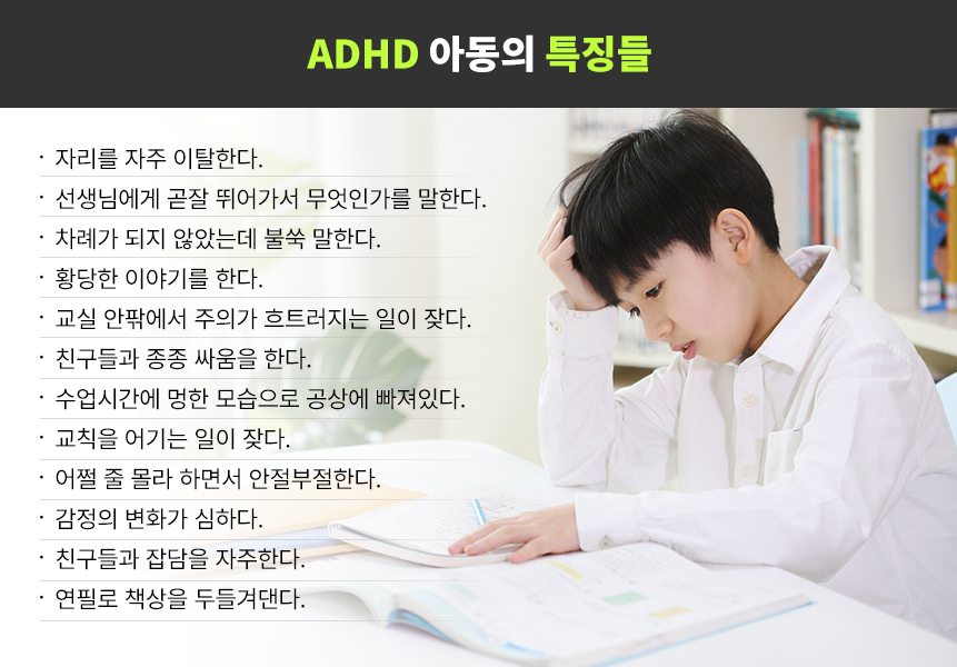 ADHD 아동들은 학교. 집 같은 주요 환경에서 자신의 행동을 적절히 통제하는 데 많은 어려움을 느끼고, 자신이 해야 할 일에 집중하지 못하는 성향을 보입니다.